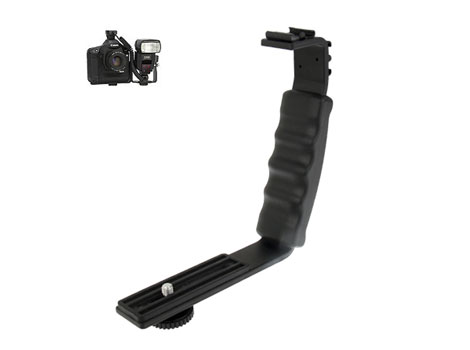Este flash bracket o brazo para flash electronico sirve para evitar los ojos rojos que normalmente se producen en la fotografia de noche, ya que permite alejar el golpe de luz del flash de su eje con el lente. Tiene dos posiciones o zapatas para toma de fotos verticales y horizontales.
