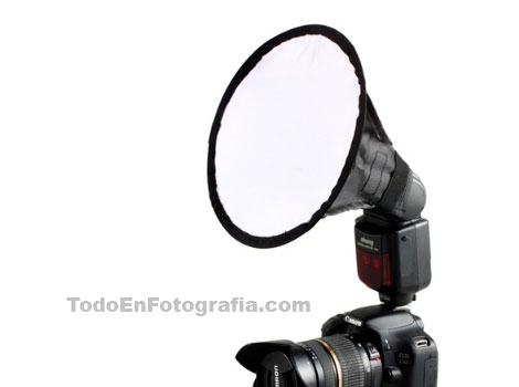 Práctico difusor redondo – de 20 cm de diámetro- que se adapta por medio de unas correas a cualquier flash speedlight que le ayuda a suavizar las sombras y evitar los reflejos fuertes.
