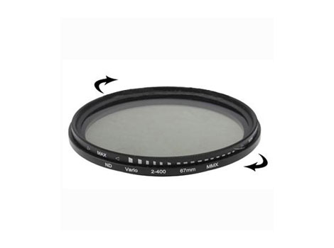 Filtro de Densidad Neutra 400 graduable de 2 a 8 pasos mediante un simple giro. Este filtro variable de densidad neutra consiste en dos capas polarizadoras que giran para aumentar o disminuir el efecto del filtro de tal forma que puede lograr disminuir la entrada de luz al sensor de la cámar entre dos y 9 pasos (diafragmas) aproximadamente.