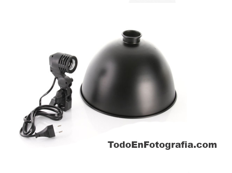 Dentro del reflector se puede colocar o bien un bombillo LED o un flash de rosca E-27. Este es un accesorio muy necesario en la toma de fotografia de estudio para direccionar la luz, iluminar un fondo, etc.